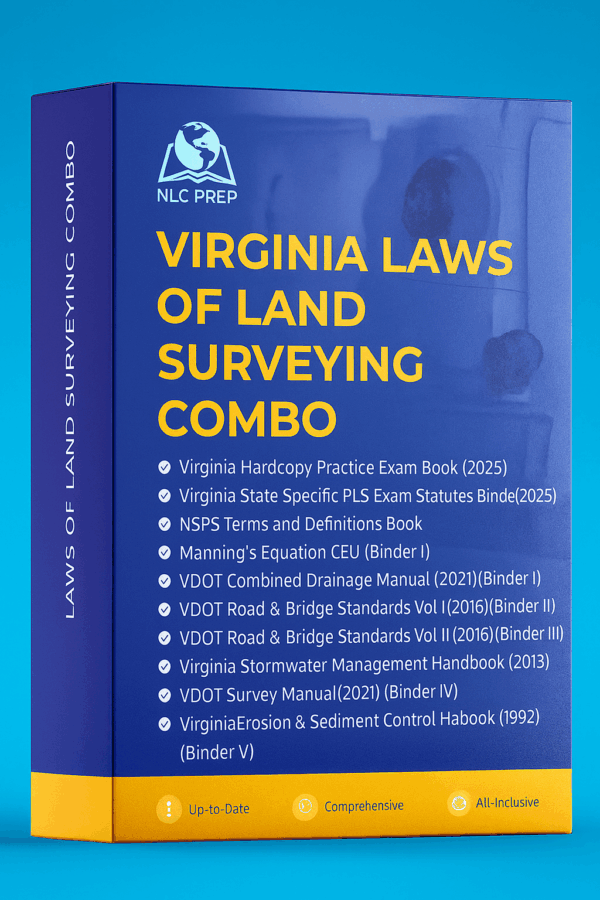 Prepare thoroughly for the Virginia Professional Land Surveyor (PLS) exam with this comprehensive Virginia Practice Exam Combo. Designed for serious candidates, this all-inclusive bundle features the essential exam prep materials alongside key Virginia-specific statutes and technical manuals to ensure you’re fully equipped for success.